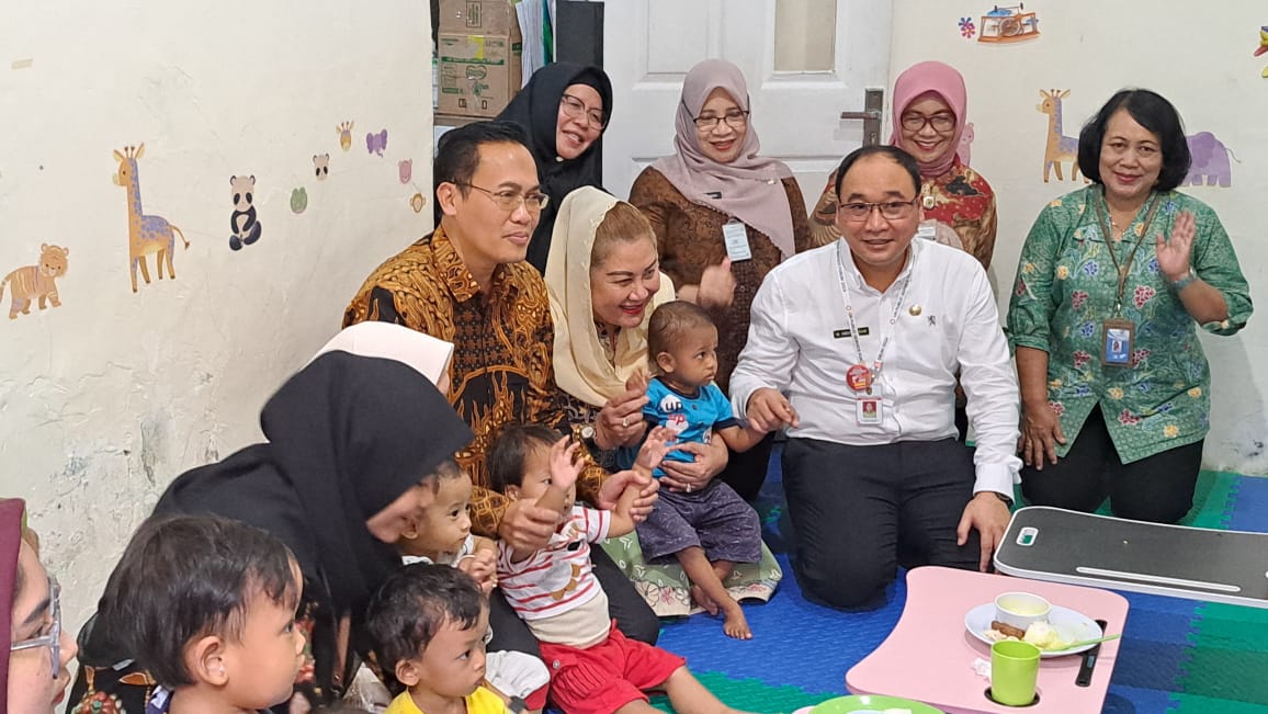 Mbak Ita bersama Sesmen terlihat berinteraksi dengan anak-anak stunting yang dititipkan di daycare.