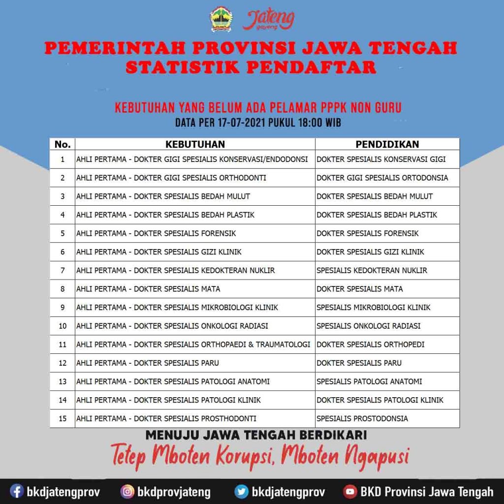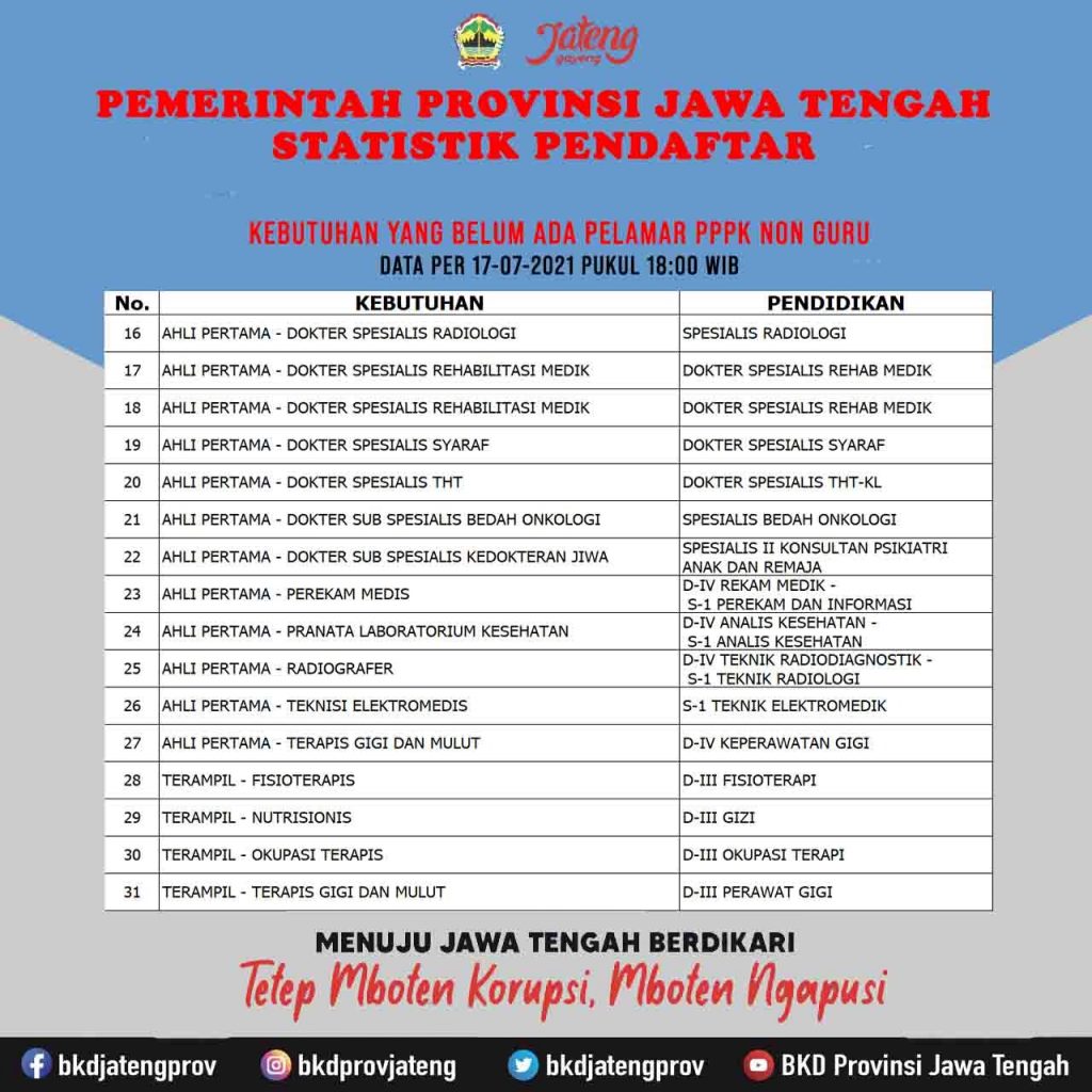 Kepala Badan Kepegawaian Daerah (BKD) Jateng Wisnu Zaroh, melalui Kabid Mutasi BKD Legiman, membenarkan hal tersebut. Ia menyebut, hingga tanggal 17 Juli pukul 18.00, empat formasi CPNS dan 31 PPPK non guru masih nihil pelamar.