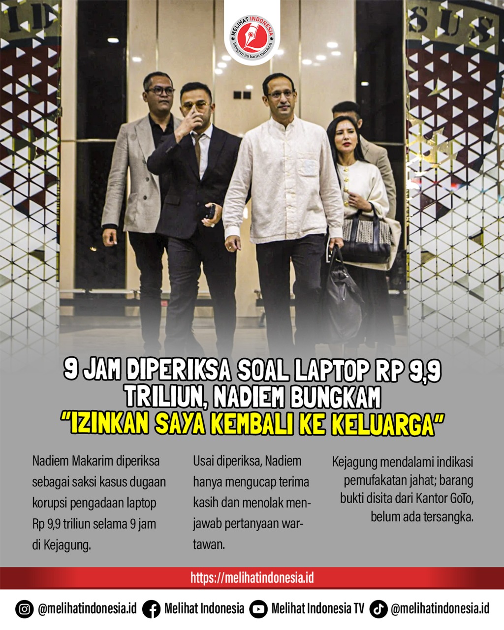 Mantan Menteri Pendidikan, Kebudayaan, Riset, dan Teknologi (Mendikbudristek) Nadiem Makarim rampung diperiksa oleh penyidik Kejaksaan Agung (Kejagung) dalam kasus dugaan korupsi pengadaan laptop Chromebook dalam Program Digitalisasi Pendidikan periode 2019–2022. Pemeriksaan dilakukan pada Selasa (15/7).