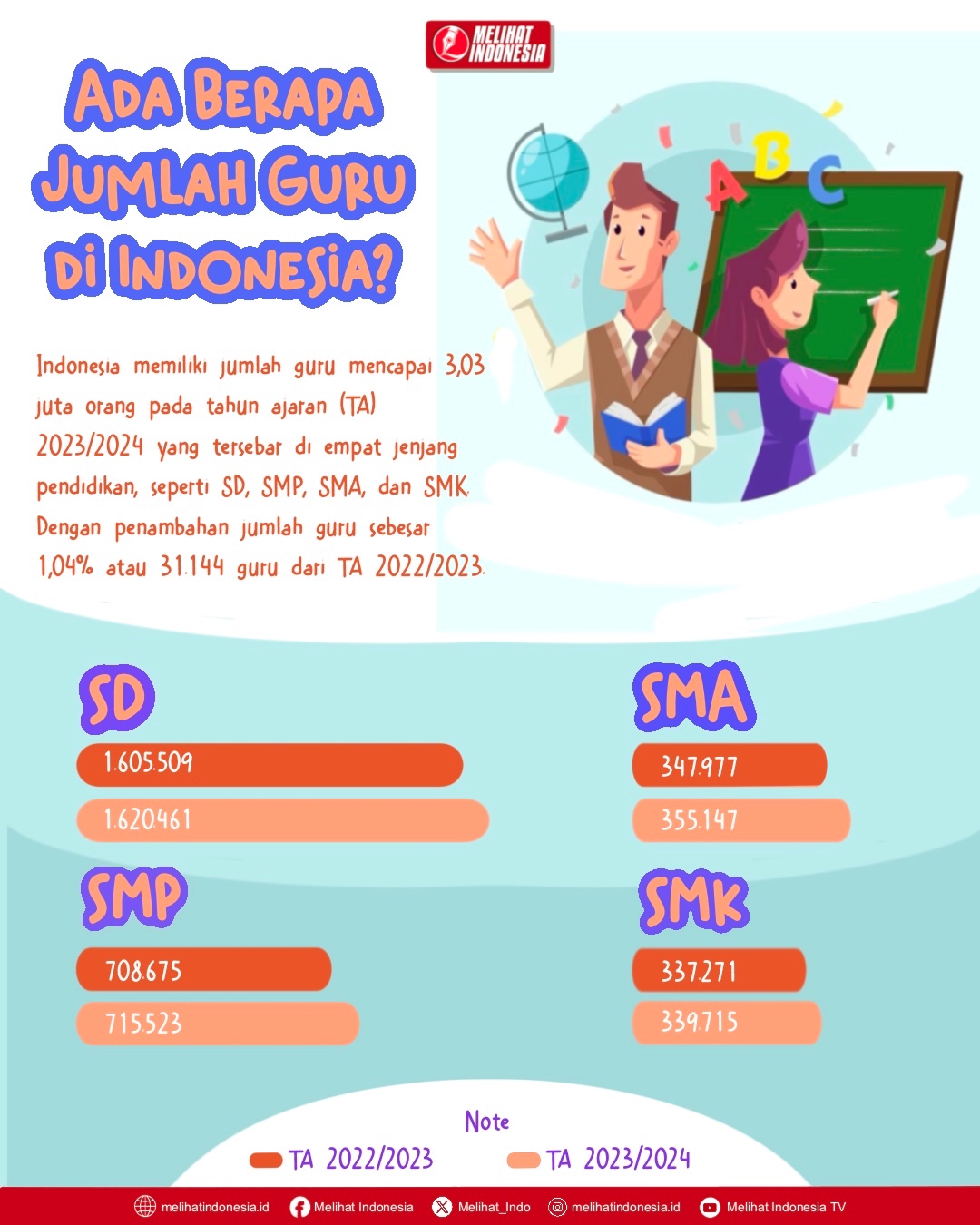 MELIHAT INDONESIA – Indonesia memiliki jumlah guru mencapai 3,03 juta orang pada tahun ajaran (TA) 2023/2024 yang tersebar di empat jenjang pendidikan, seperti SD, SMP, SMA, dan SMK.
