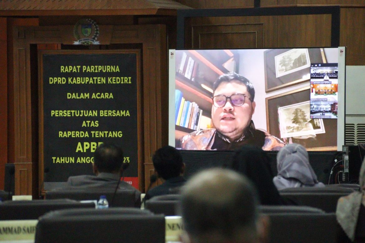 Mas Dhito menyampaikan permintaan maaf karena berhalangan untuk bisa hadir secara langsung sehingga terpaksa hadir secara virtual. Selaku bupati, pihaknya membuka seluas-luasnya masukan, kritik, serta saran dari DPRD Kabupaten Kediri.