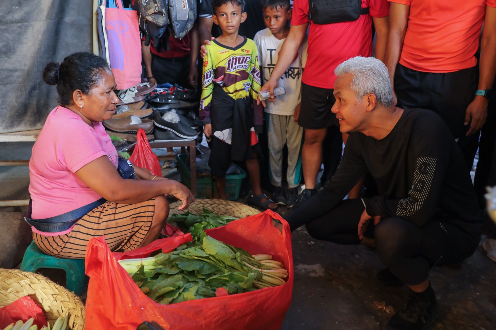 KUPANG – Ganjar Pranowo, Capres 2024 nomor urut 3 menikmati pagi di Kota Kupang, Nusa Tenggara Timur (NTT) dengan menyapa warga di acara Car Free Day, Sabtu (2/12/2023). Dalam kesempatan itu, ia menyempatkan diri untuk blusukan ke Pasar Inpres Naikoten I.