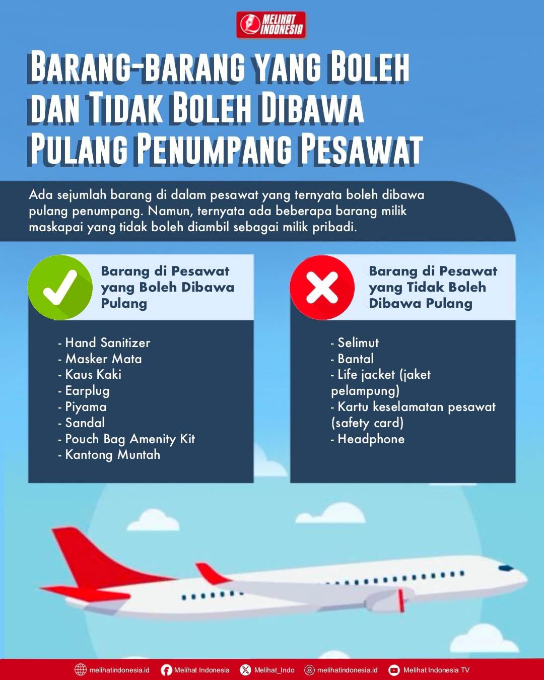 MELIHAT INDONESIA – Ada sejumlah barang di dalam pesawat yang ternyata boleh dibawa pulang penumpang.