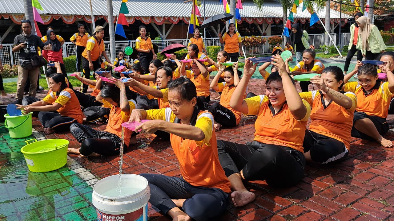 Pada Jumat (2/8/2024), para napi mengikuti lomba estafet air yang dilakukan secara kelompok. Mereka duduk berderet, memindahkan air dengan piring dari arah depan ke barisan belakang.