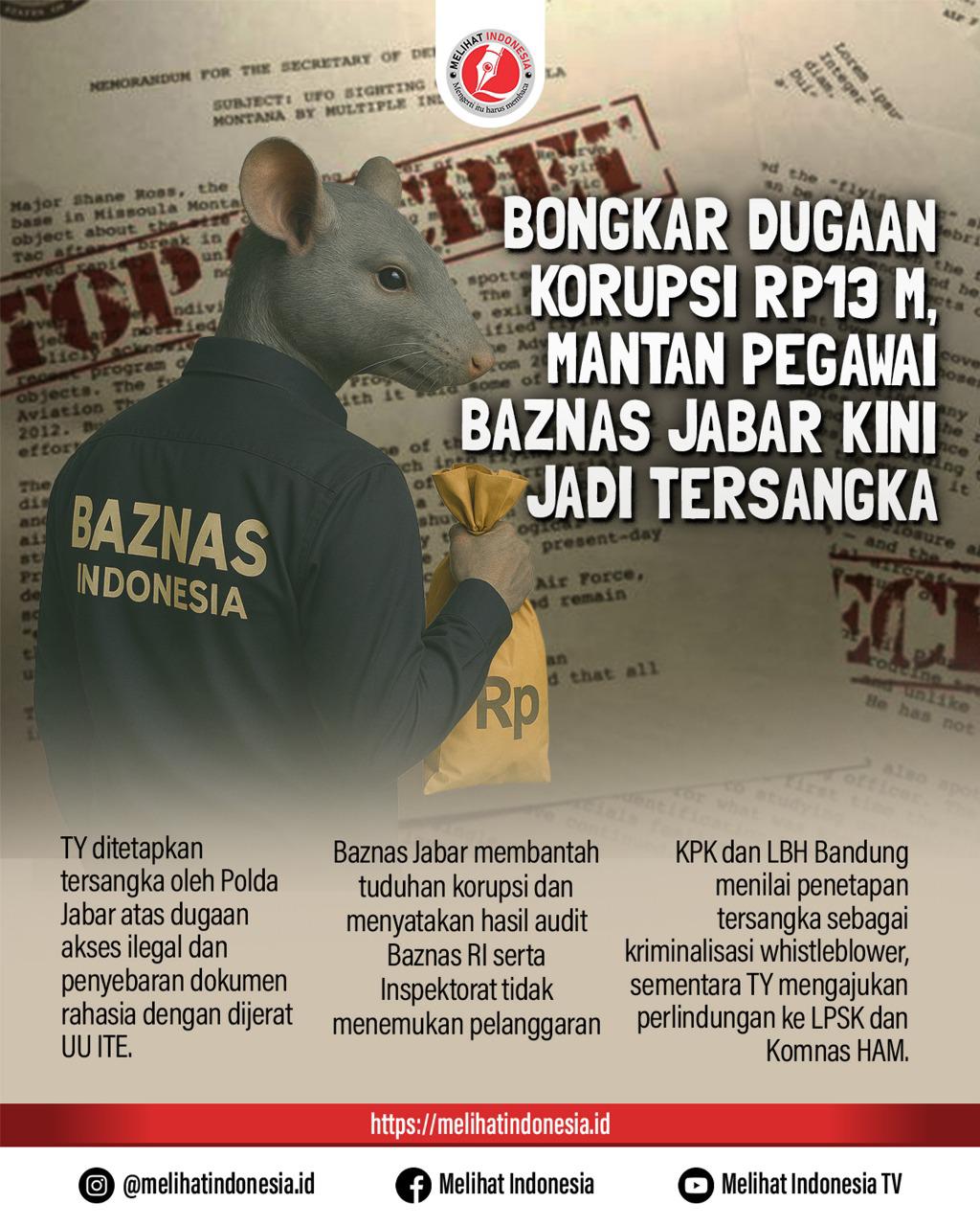 Nasib nahas dialami Tri Yanto (TY), mantan Kepala Kepatuhan dan Satuan Audit Internal Baznas Jawa Barat. Ia yang semula melaporkan dugaan korupsi dana zakat dan hibah di Baznas Jabar, kini justru ditetapkan sebagai tersangka oleh Polda Jawa Barat.