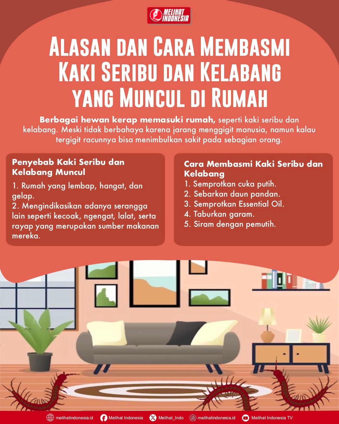MELIHAT INDONESIA – Berbagai hewan kerap memasuki rumah, seperti kaki seribu dan kelabang.