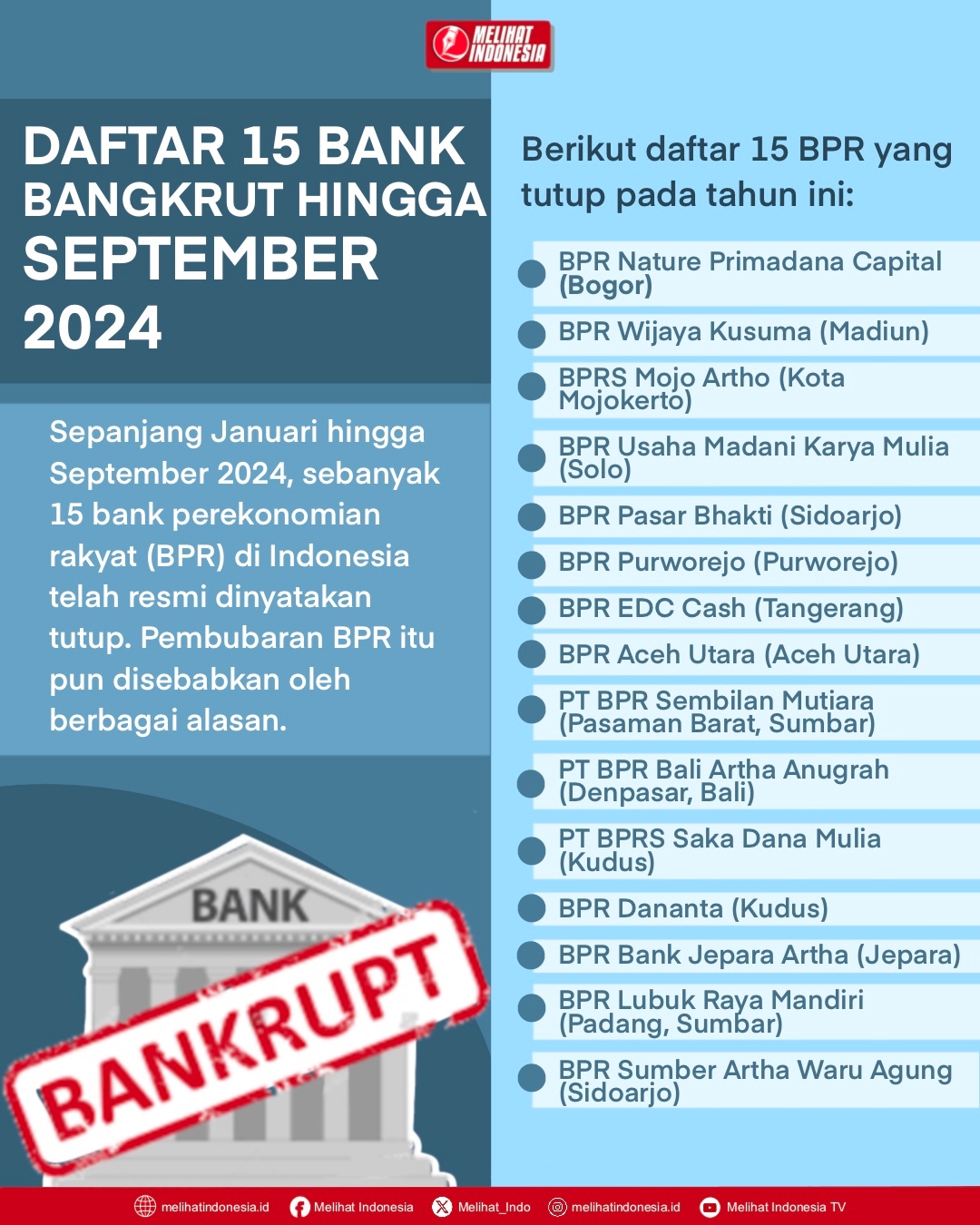 MELIHAT INDONESIA – Sepanjang Januari hingga September 2024, sebanyak 15 bank perekonomian rakyat (BPR) di Indonesia telah resmi dinyatakan tutup.