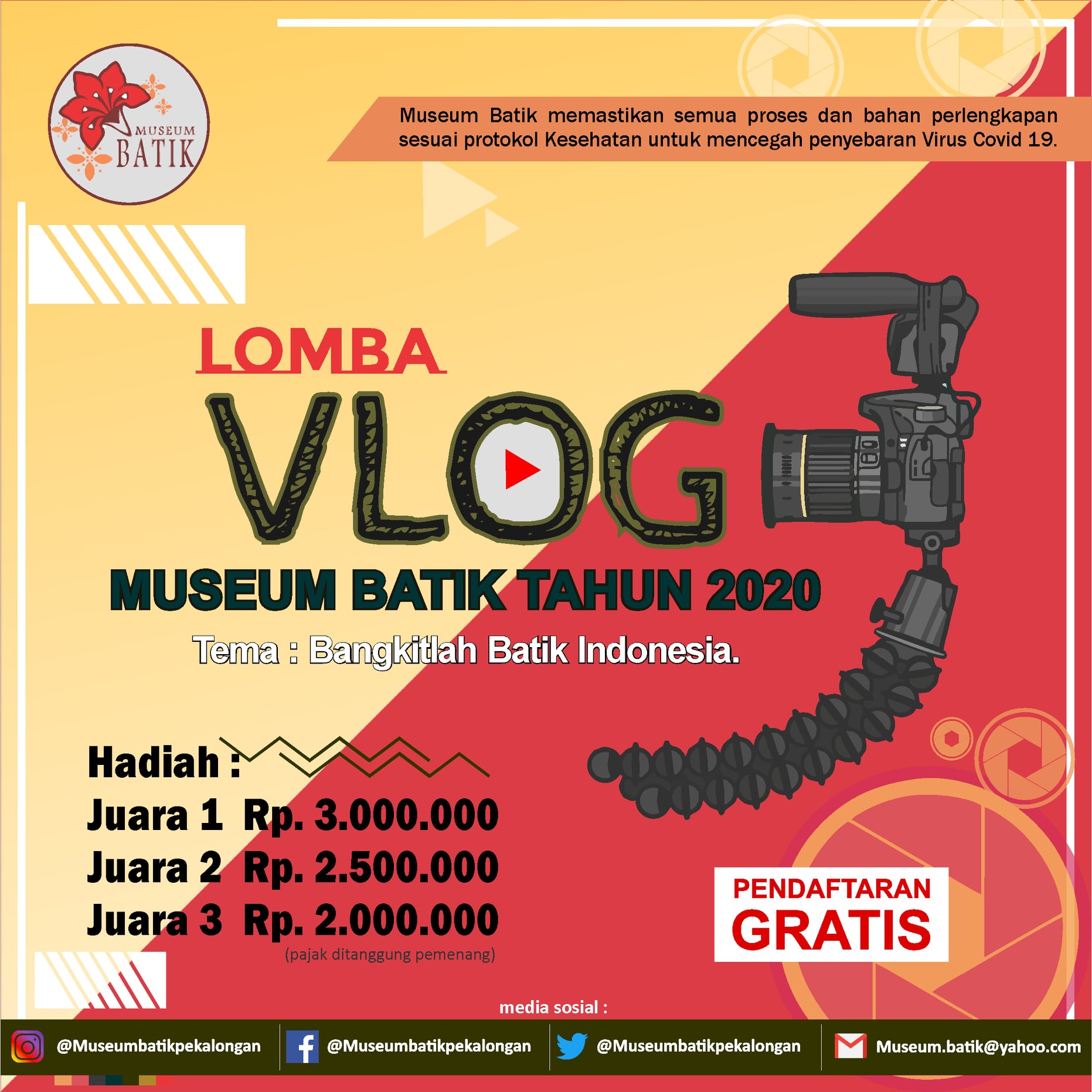Lomba Vlog Museum Batik Pekalongan 2020 Kegiatan ini adalah salah satu dari rangkaian kegiatan peringatan Hari Batik Nasional tahun 2020.