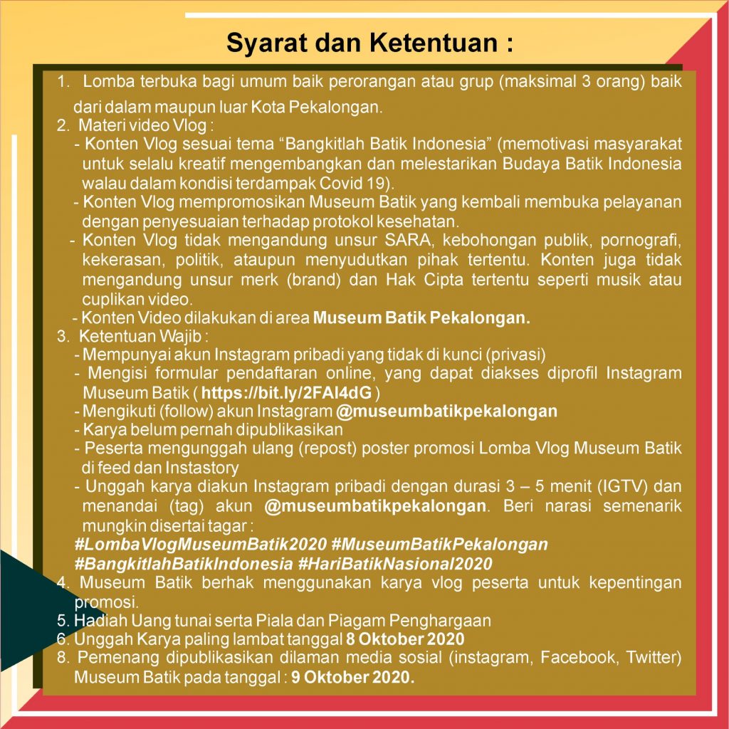 Ketentuan Wajib: – Mempunyai akun Instagram pribadi yang tidak di kunci – Mengisi formular pendaftaran online pada tautan dalam profil Instagram @museumbatikpekalongan – Mengikuti (follow) akun Instagram @museumbatikpekalongan