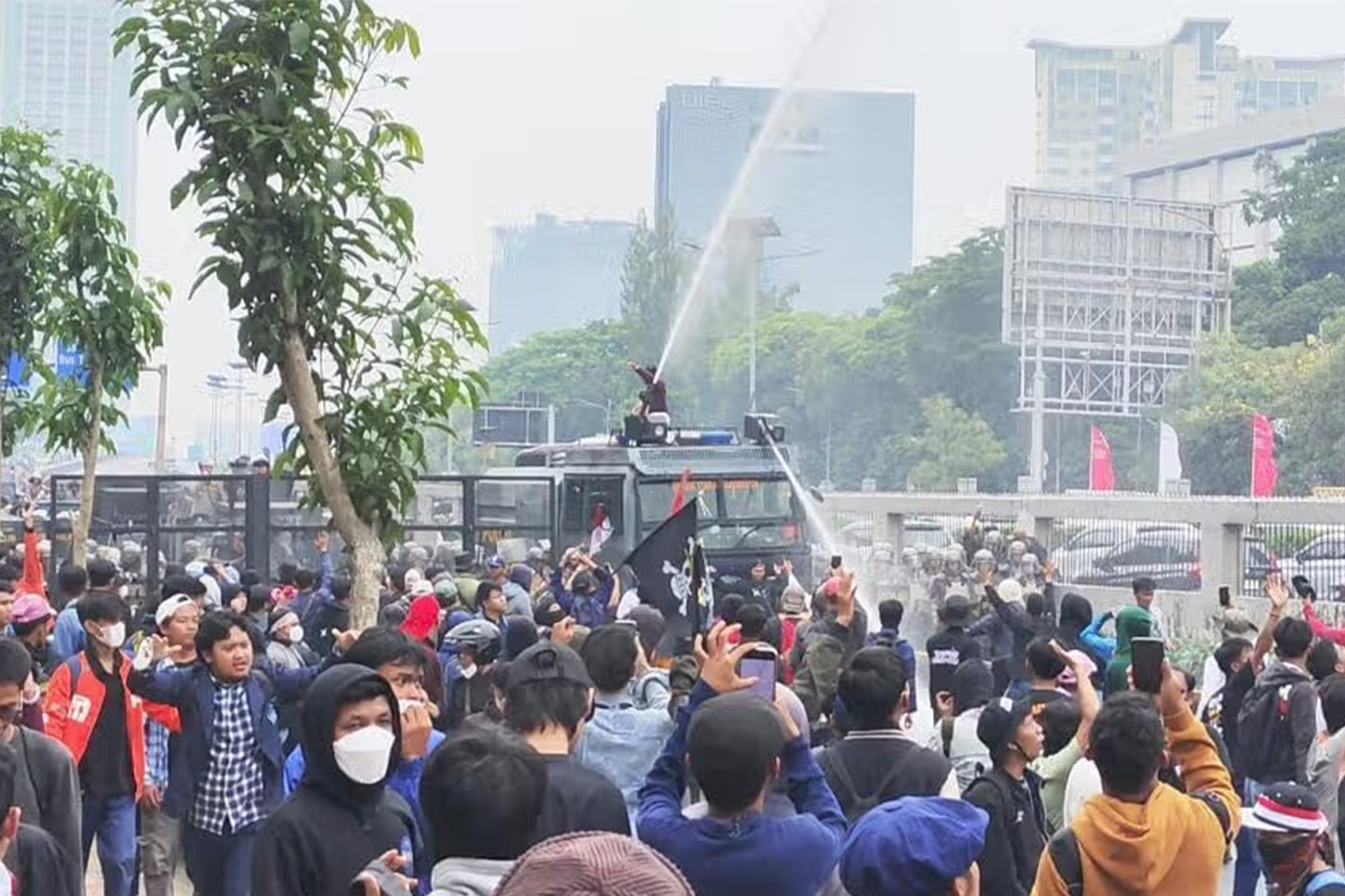 Untuk membubarkan kerumunan, petugas mengerahkan mobil water cannon yang menyemprotkan air ke arah demonstran.