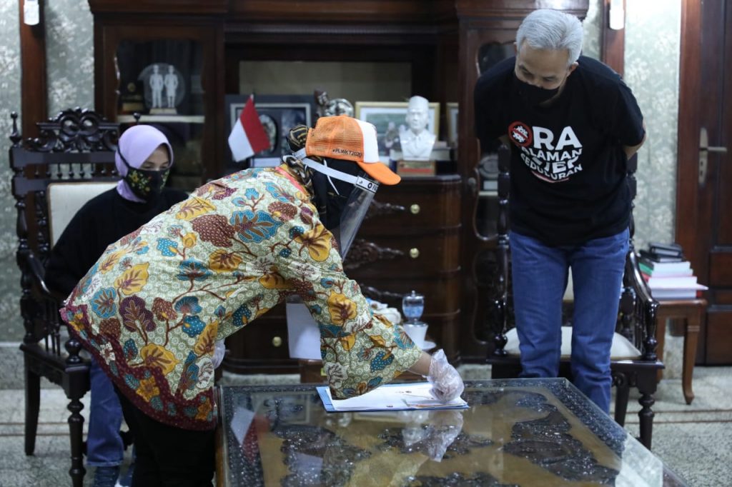 SEMARANG – Rombongan petugas penyelenggara pemilu mendatangi kediaman Gubernur Jawa Tengah, Ganjar Pranowo, Sabtu (18/7) malam. Mengenakan alat pelindung diri lengkap, mereka datang untuk melakukan pencocokan dan penelitian (Coklit) data pemilu 2020 kepada Ganjar dan keluarga.