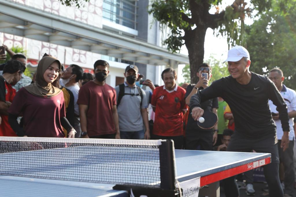 Suasana seru tersaji saat Ganjar dan Rudy saling adu smash. Warga yang melihat tak menyangka ternyata Ganjar dan istri jago main tenis meja.