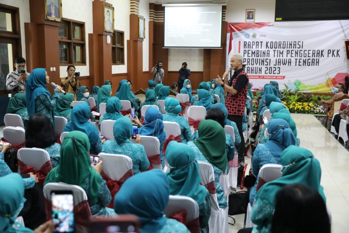 “Tidak hanya stunting ya, tapi kami lagi coba minta dorongan, bantuan, dan aksi dari PKK karena PKK ini rajinnya minta ampun,” kata Ganjar usai memberikan pengarahan dan membuka Rapat Koordinasi Pembina TP PKK Provinsi Jawa Tengah di Aula Kantor Dispermasdes Provinsi Jawa Tengah, Selasa (21/3/2023).