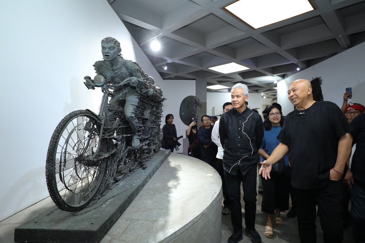 Nyoman Nuarta begitu bersemangat mengajak Ganjar berkeliling menyusuri museum. Sejumlah karya seni rupa yang dipamerkan membuat Ganjar terpana.