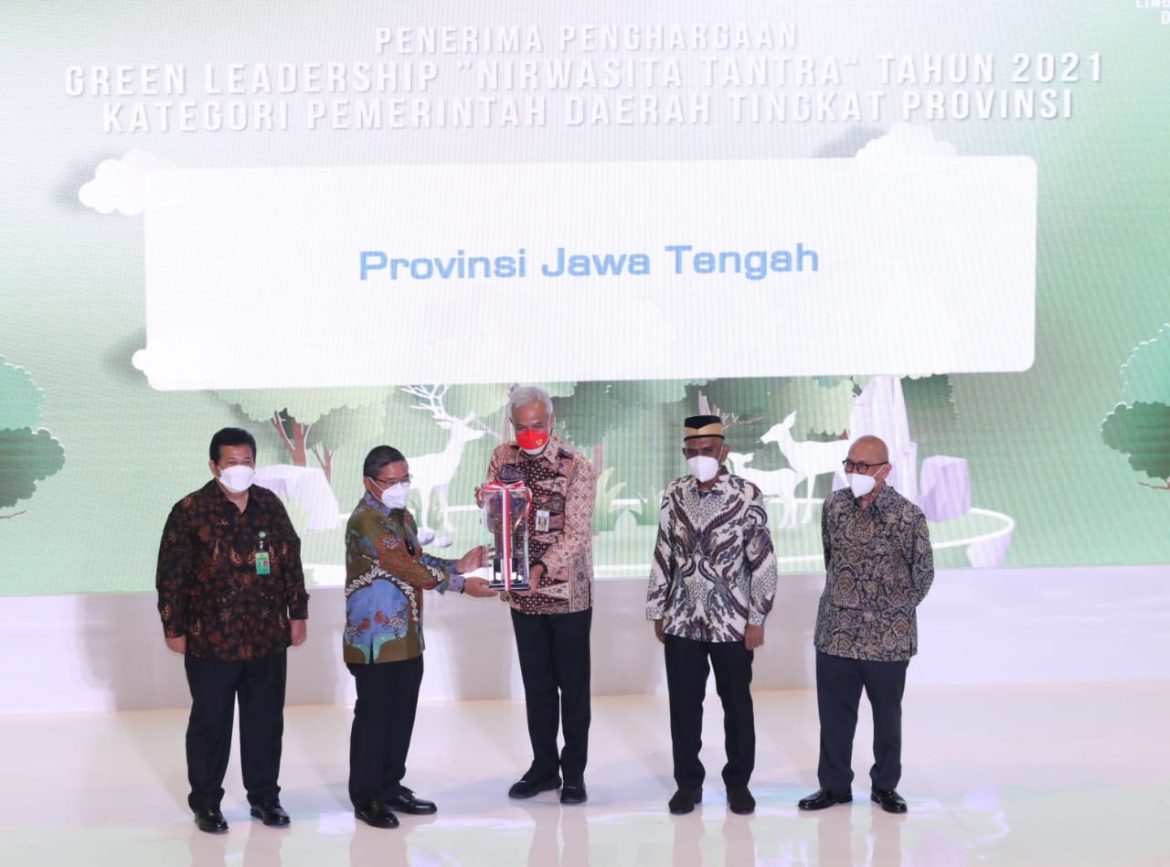 JAKARTA – Gubernur Jawa Tengah Ganjar Pranowo menerima penghargaan Green Leadership Nirwasita Tantra 2021 dari Kementerian Lingkungan Hidup dan Kehutanan (KLHK). Jawa Tengah berhasil meraih peringkat pertama untuk kategori pemerintah provinsi, diikuti Jawa Barat dan Jawa Timur di peringkat dua dan tiga. Penghargaan diterima langsung oleh Ganjar Pranowo dari Wakil Menteri LHK Alue Dohong di Gedung Manggala Wanabakti, Jakarta, Rabu (20/7/2022).