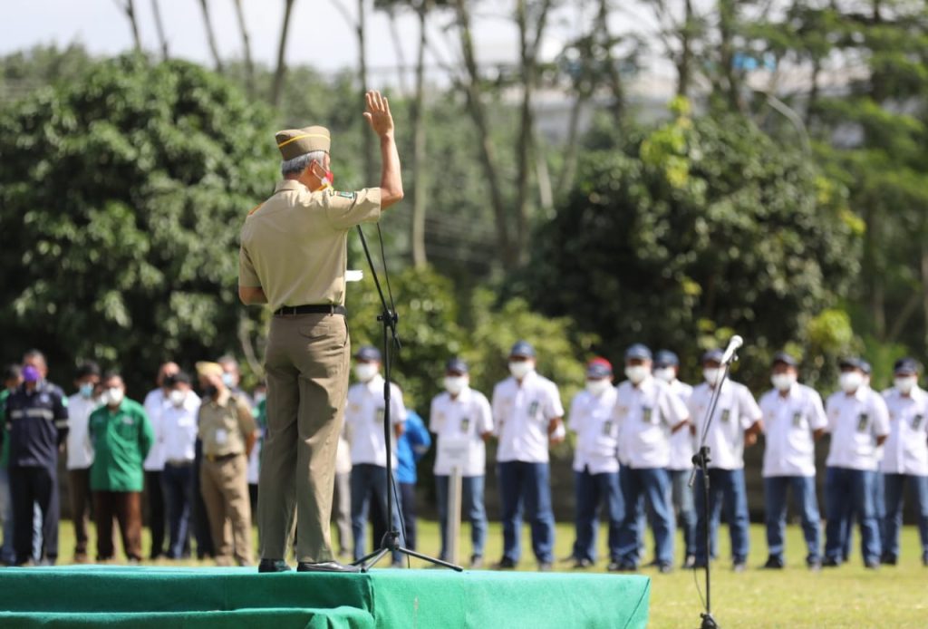 SEMARANG – Gubernur Ganjar Pranowo membahas momen kebakaran Relokasi Pasar Johar Masjid Agung Jawa Tengah (MAJT) saat memimpin apel upacara Bulan K3 Nasional Tahun 2022 di halaman PT. Kubota Indonesia, Semarang, Kamis (3/2).