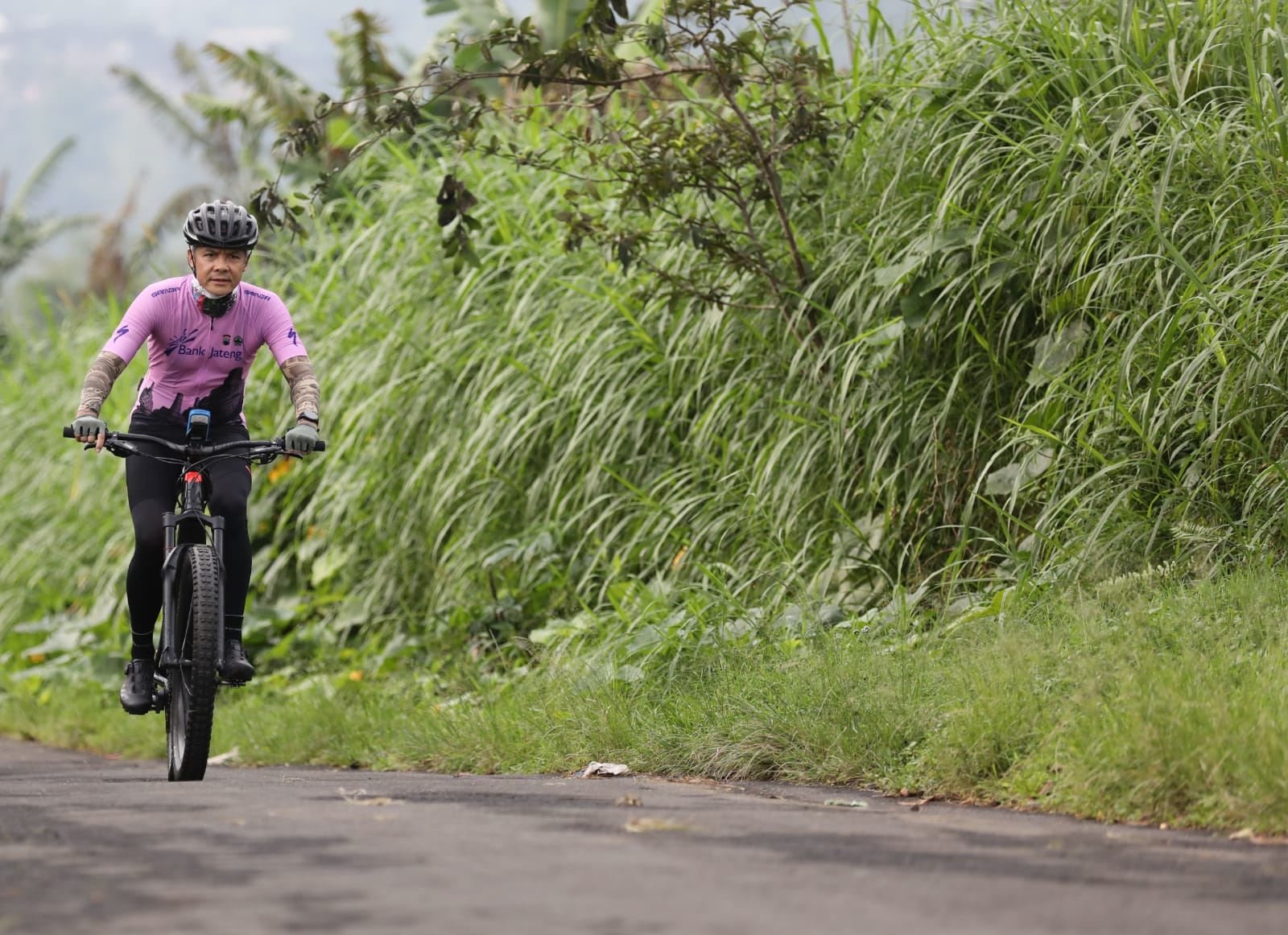 MAGELANG – Gubernur Jawa Tengah, Ganjar Pranowo nampak kepayahan menaklukkan tanjakan terakhir sebelum finish event Tour de Borobudur, Minggu (7/11). Nafasnya ngos-ngosan, keringat bercucuran di wajahnya.