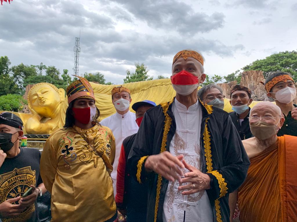 Saat hendak masuk ke dalam Vihara, Ganjar disambut tarian tradisional Mojopahit. Ia juga diberi pakaian khas Mojopahit lengkap dengan ikat kepala. Selama diajak berkeliling, Ganjar tak luput dari kerumunan massa. Mereka yang didominasi emak-emak itu, berebut mendekat dan minta foto ke Ganjar.