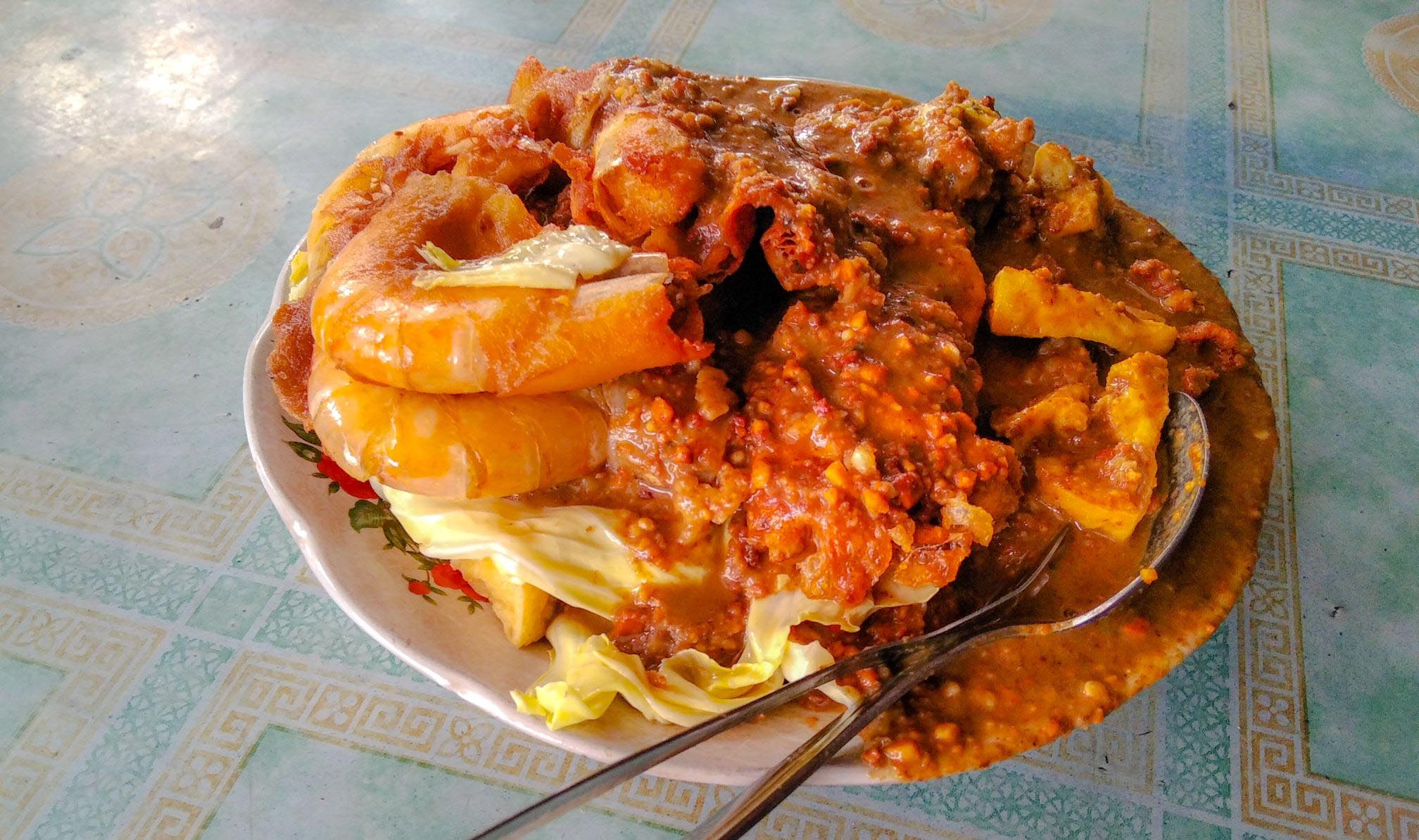 Dalam seporsi tahu gimbal, potongan tahu goreng disajikan bersama irisan kubis, tauge, dan taburan bawang goreng. Yang membuatnya semakin istimewa adalah siraman saus kacang yang diolah dengan campuran petis, asam jawa, dan kecap manis. Setiap komponen bersatu padu, menciptakan harmoni rasa yang kaya dan memanjakan lidah.