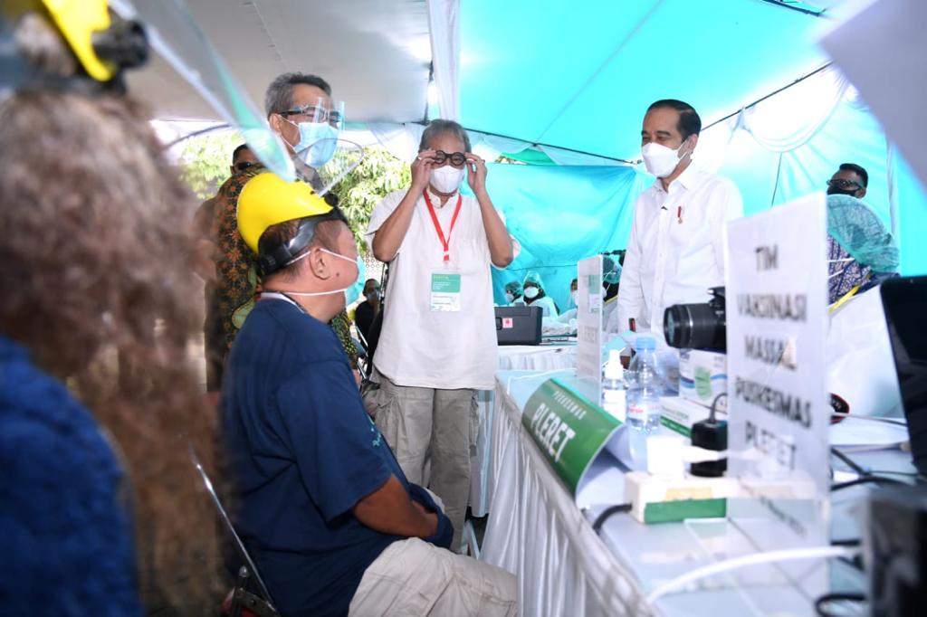 BANTUL – Presiden Joko Widodo meninjau pelaksanaan vaksinasi massal di Padepokan Seni Bagong Kussudiarja yang berlokasi di Dusun Kembaran, Kecamatan Kasihan, Kabupaten Bantul, Daerah Istimewa Yogyakarta, Rabu (10/3).