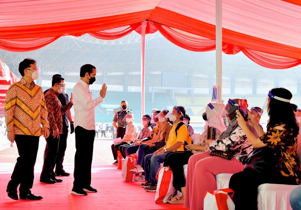 BEKASI – Presiden Joko Widodo meninjau pelaksanaan vaksinasi Covid-19 massal yang digelar di Stadion Patriot Candrabhaga, Bekasi Selatan, Kota Bekasi, Senin (14/6) pagi. Presiden meminta pelaksanaan vaksinasi massal yang dapat mencakup sasaran vaksinasi dalam jumlah banyak, seperti yang dilaksanakan di Stadion Patriot ini, dapat diterapkan di wilayah lain Tanah Air.