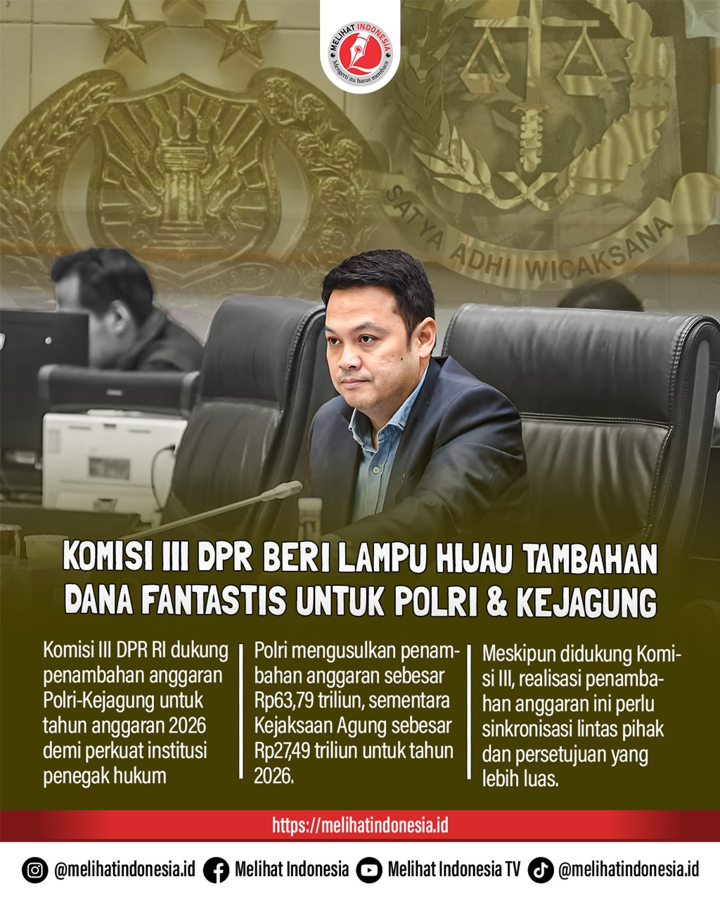 DPR RI Komisi III mendukung usulan penambahan anggaran Kepolisian Republik Indonesia (Polri) dan Kejaksaan Agung (Kejagung) untuk Tahun Anggaran (TA) 2026. Dukungan ini disampaikan oleh Wakil Ketua Komisi III DPR RI, Dede Indra Permana Soediro, dalam rapat kerja dengan Polri dan Kejagung di Kompleks Parlemen, Jakarta, pada Senin (7/7/2025).