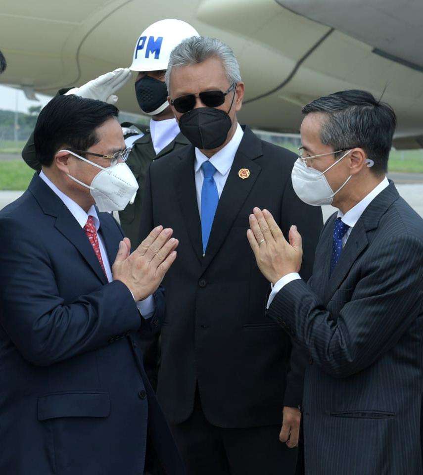 PM Vietnam tampak melambaikan tangan begitu pintu pesawat dibuka. Di bawah tangga pesawat, ia disambut oleh Direktur Jenderal Protokol dan Konsuler Kementerian Luar Negeri sekaligus Kepala Protokol Negara Andy Rachmianto.
