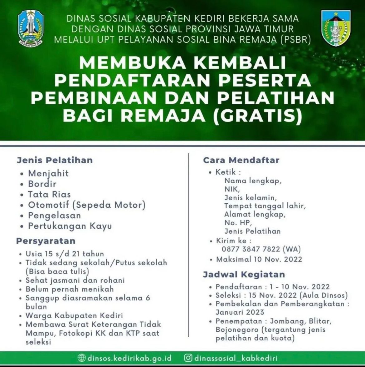 Bupati Kediri Hanindhito Himawan Pramana melalui Pelaksana Tugas Kepala Dinas Sosial Dyah Saktiana menyampaikan, pendaftaran pelatihan dibuka mulai 1-10 November 2022.