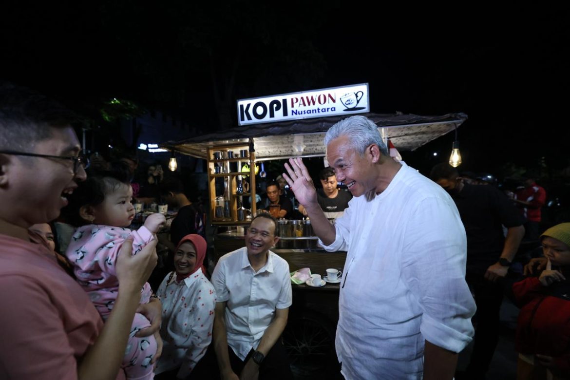 SEMARANG – Ganjar Pranowo mengisi masa tenang kampanye dengan bersantai dan ngopi di warung kaki lima di Jalan Pahlawan dekat Lapangan Pancasila Simpang Lima Kota Semarang, Senin (12/2/2024) malam. Capres nomor urut 03 itu ditemani Cak Lontong, komedian senior.