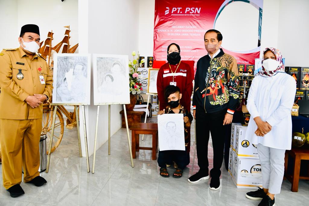 Setibanya di Bandar Udara Ngloram, Kabupaten Blora, Jumat, 17 Desember 2021, Presiden Jokowi dan Ibu Iriana Joko Widodo sempat mengunjungi beberapa gerai usaha kecil menengah (UKM) yang berada di ruang tunggu bandara tersebut.