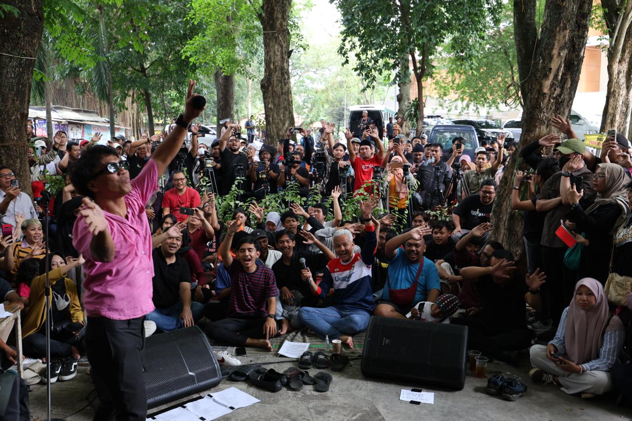 SEMARANG – Ganjar Pranowo mengisi masa tenang kampanye menonton Slank bersama warga di komplek Taman Budaya Raden Saleh Semarang, Selasa (13/2/2024). Konser mini akustik bersama Slank itu berlangsung gayeng meski sederhana.