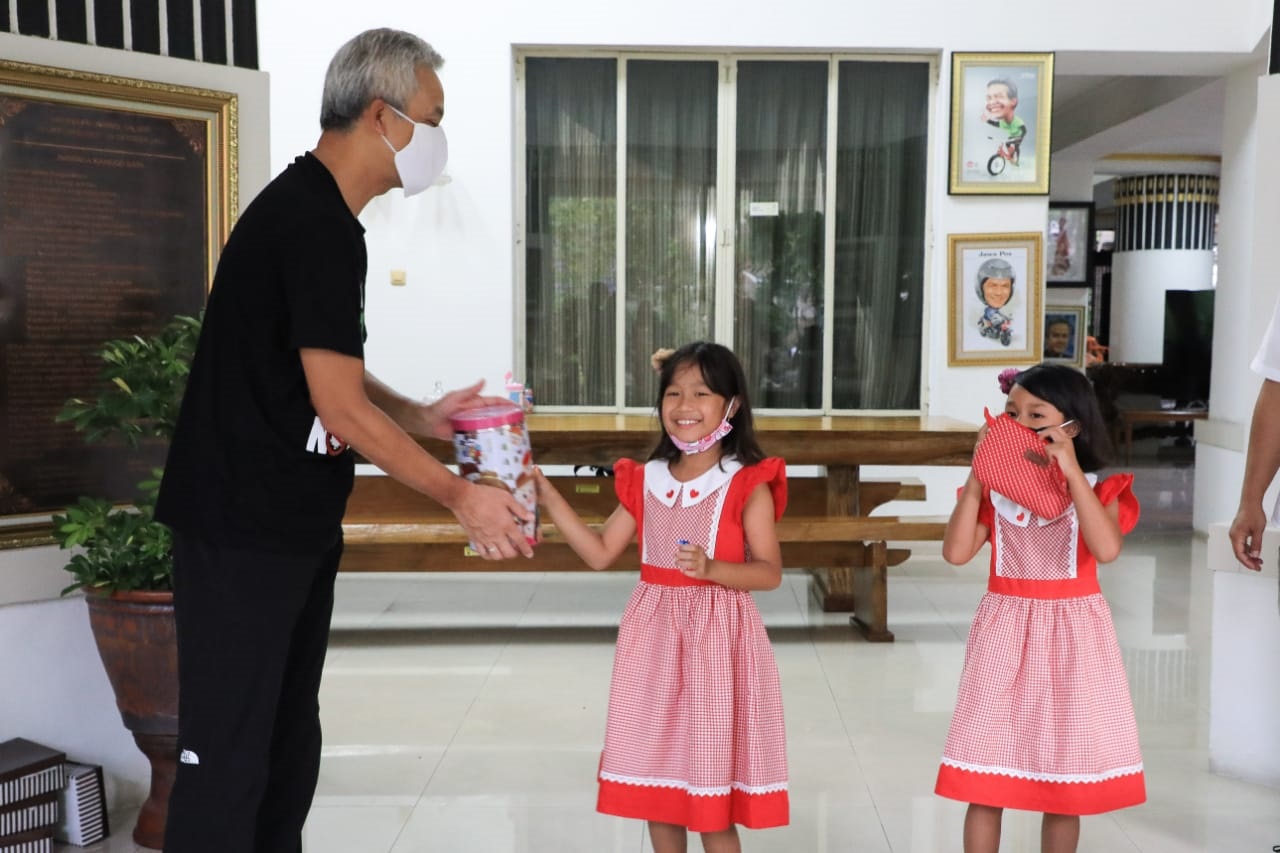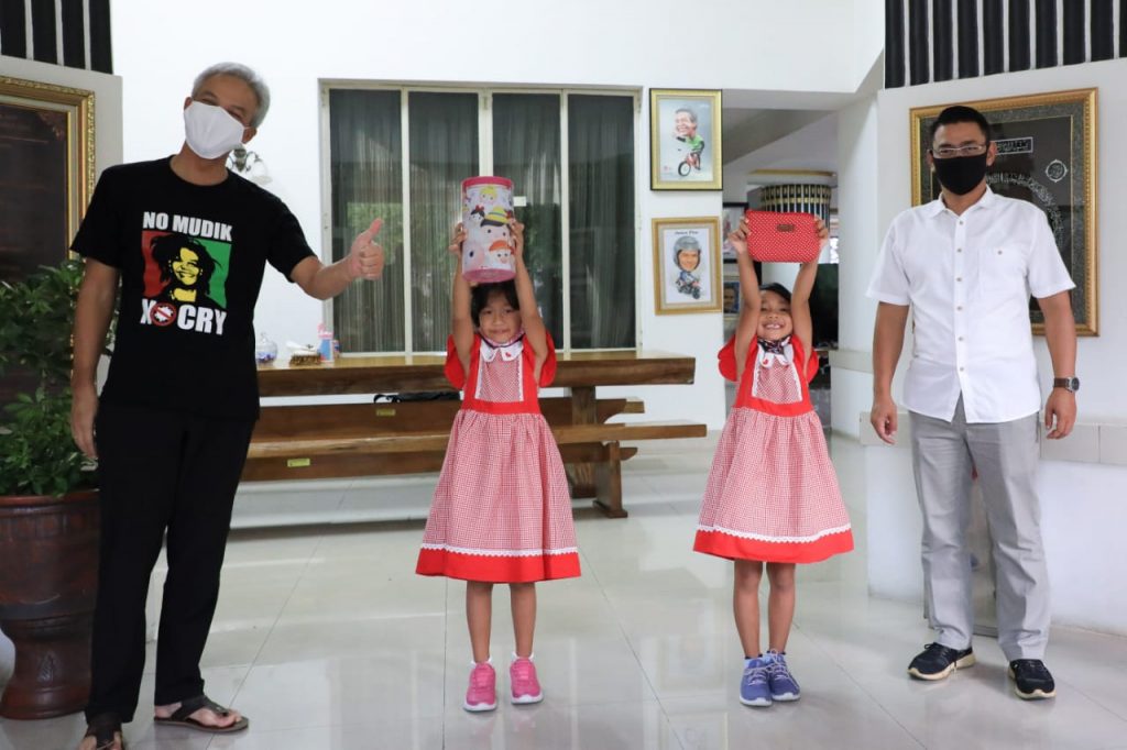SEMARANG – Gubernur Jateng Ganjar Pranowo kedatangan tamu istimewa Minggu (18/4) sore. Dua bocah datang menyumbangkan celengan kesayangannya untuk disumbangkan pada penanganan wabah COVID-19.