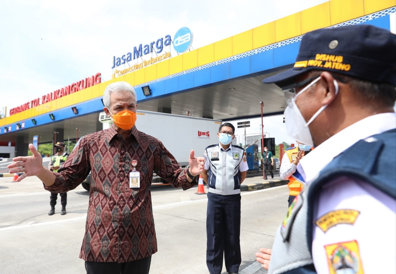 SEMARANG – Gubernur Jawa Tengah, Ganjar Pranowo melakukan pantauan ke sejumlah lokasi penyekatan arus mudik lebaran 2021, Selasa (4/5). Salah satu lokasi yang dipantau Ganjar adalah gerbang tol Kalikangkung Kota Semarang.