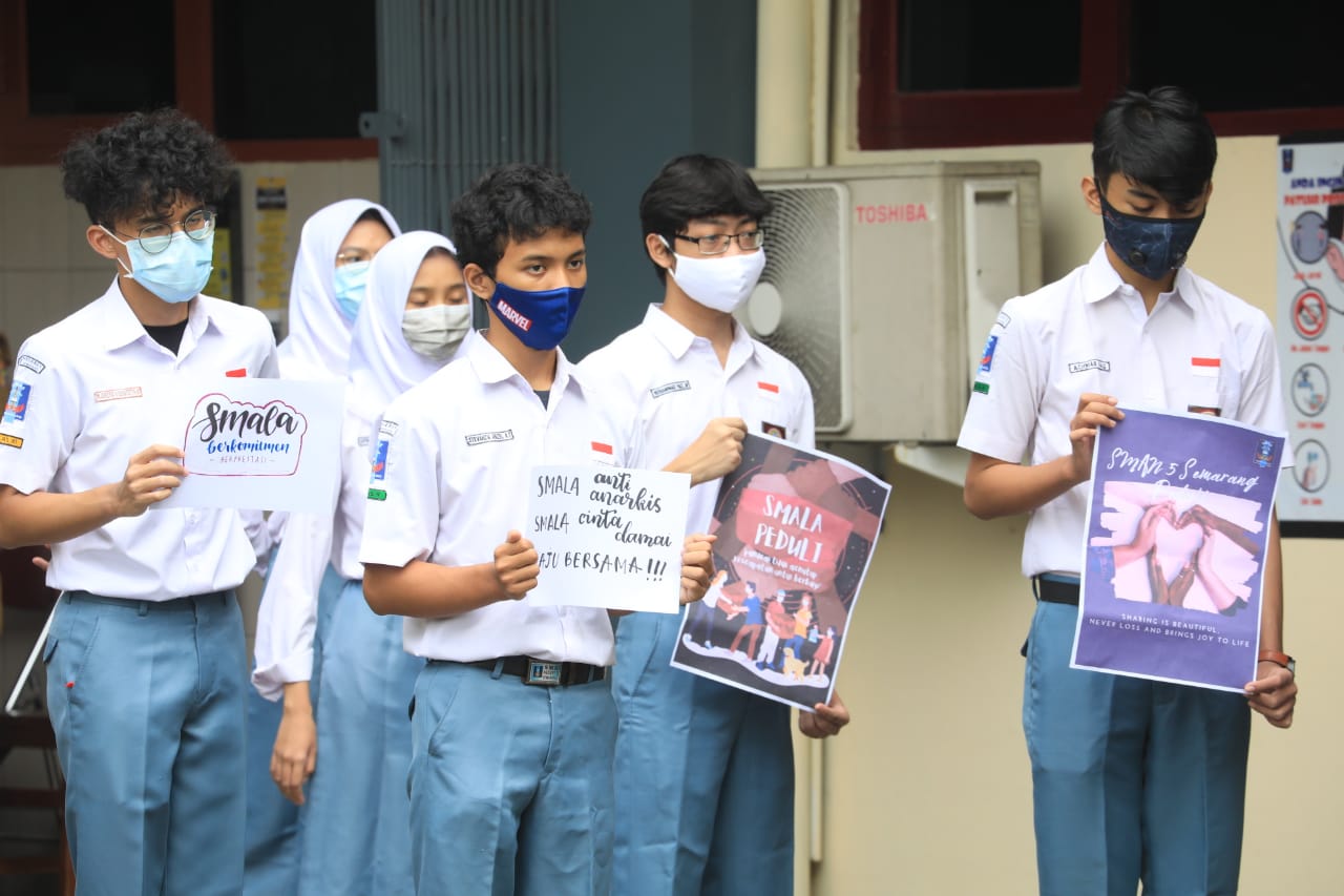 SEMARANG – Pelajar di Kota Semarang menggelar aksi cinta damai serta menolak demo dan tindakan anarkis di halaman sekolah masing-masing, Senin (19/10/2020). Aksi tersebut selain deklarasi cinta damai dan menolak ikut demo juga diisi dengan bakti sosial kepada pelajar kurang mampu dan warga sekitar yang terdampak Covid-19. Aksi damai itu di antaranya terlihat di SMAN 3 dan 5 Semarang.