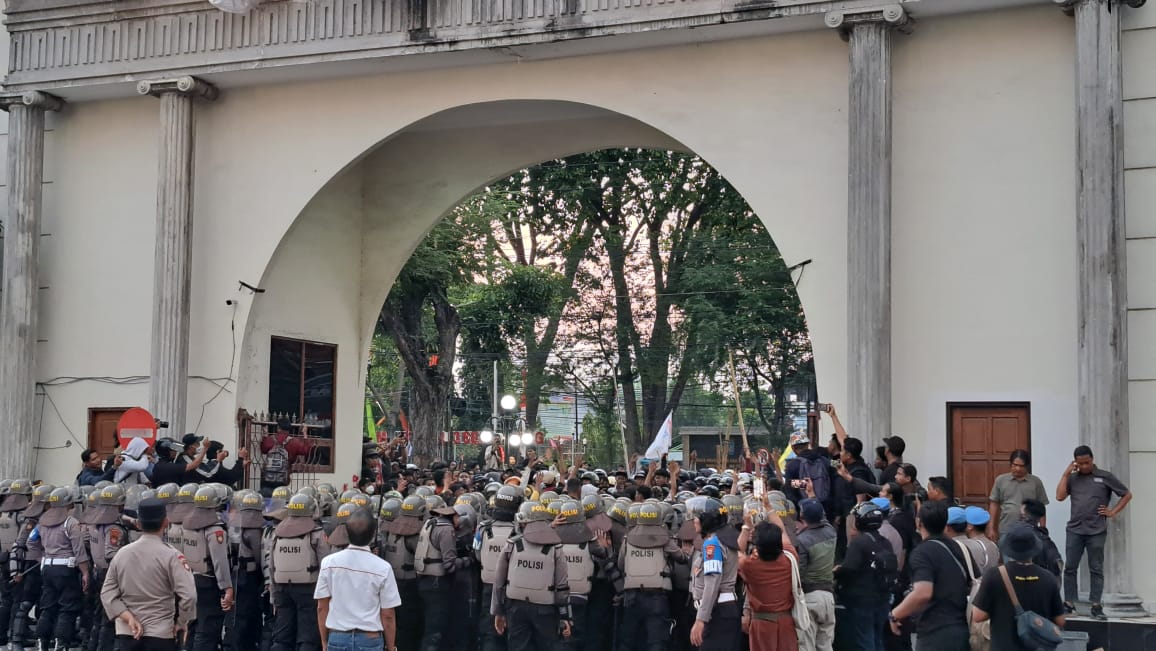 Namun, di Jalan Pahlawan depan gedung DPRD Jateng, massa hanya melintas. Mereka lanjut berkonvoi menuju Jalan Pemuda.