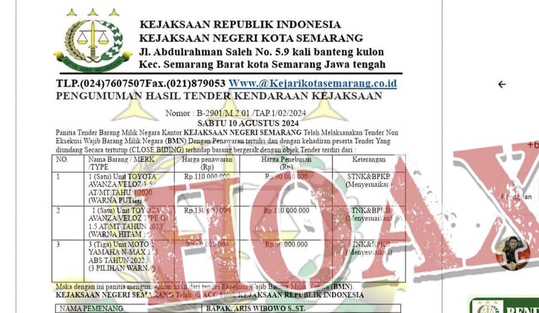 MELIHAT INDONESIA, SEMARANG – Nama Kejaksaan Negeri (Kejari) Kota Semarang dicatut untuk menyebarkan hoaks pengumuman tentang lelang kendaraan.