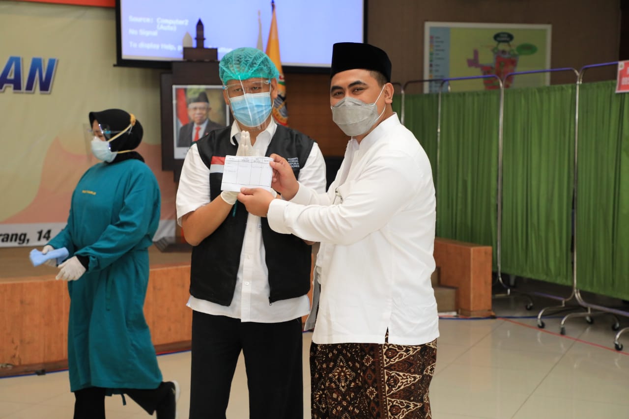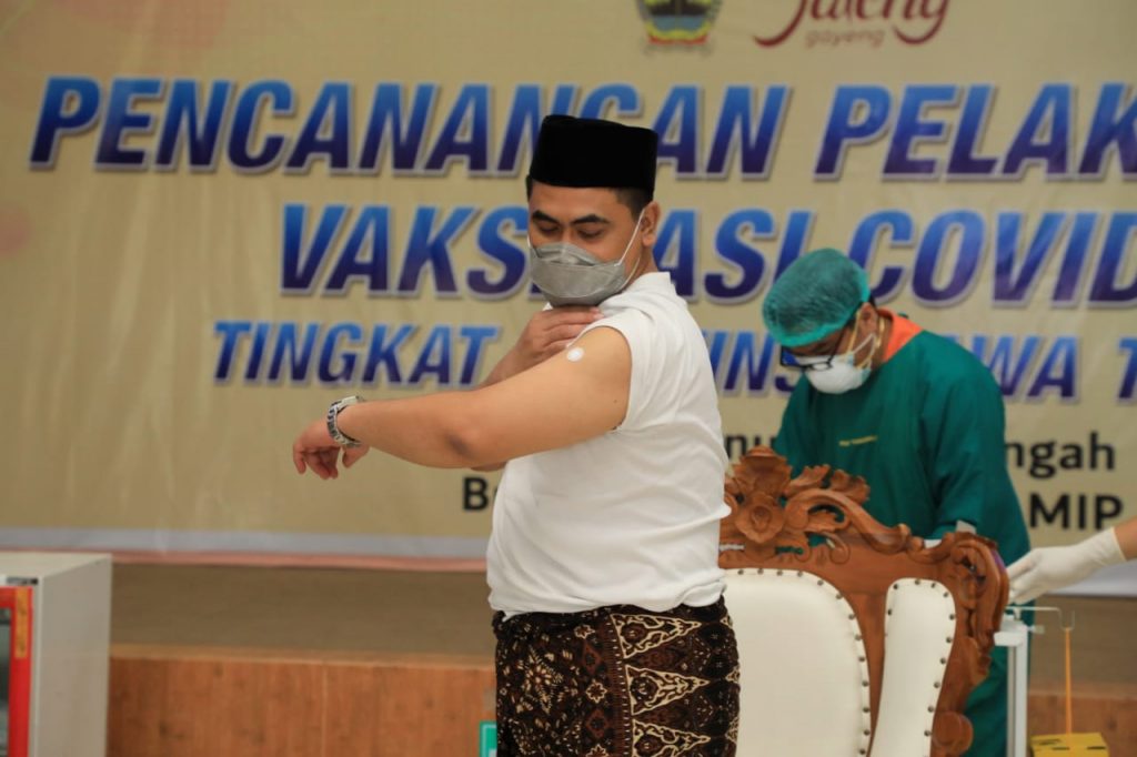 SEMARANG – Setelah Gubernur Jawa Tengah, Ganjar Pranowo divaksin untuk pertama kali di Jateng, maka orang keduanya adalah Wakil Gubernur Jateng, Taj Yasin Maimoen. Mengenakan piyama, sarung dan pecis, Gus Yasin tampak santai mengikuti proses vaksinasi yang dilakukan di RSUD Tugurejo Semarang, Kamis (14/1) itu.