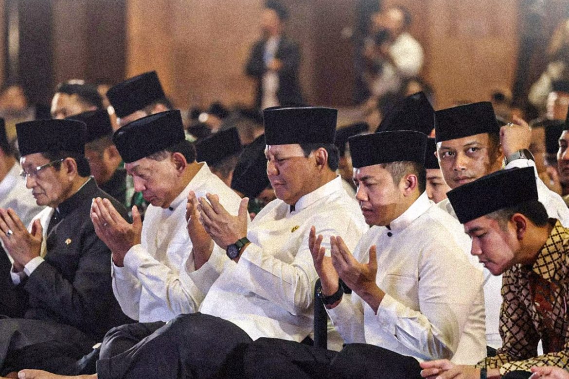Ia tampak mengenakan baju koko putih dan kopiah hitam, didampingi Wakil Presiden Gibran Rakabuming Raka yang mengenakan batik.