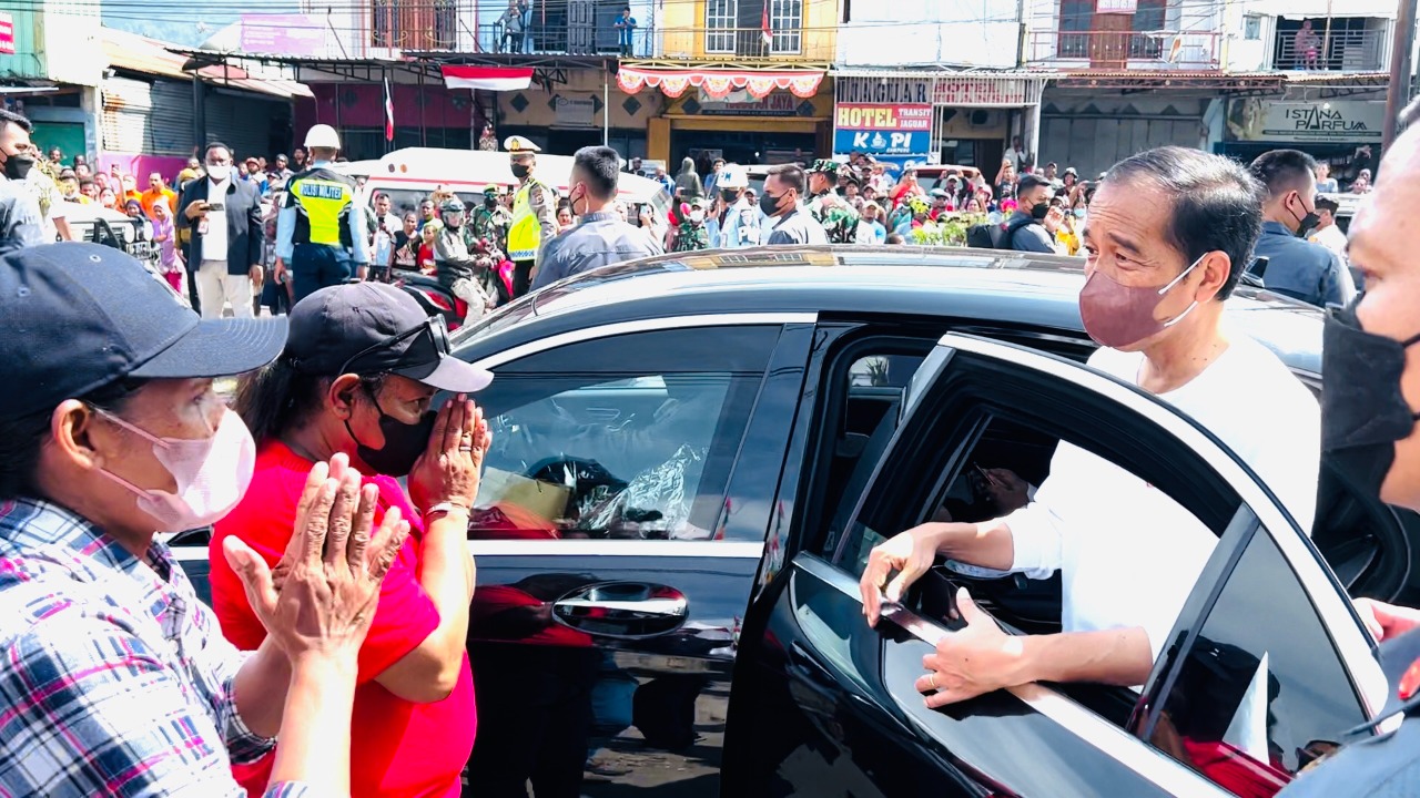 Setelah menyerahkan Bantuan Langsung Tunai (BLT) Bahan Bakar Minyak (BBM) dan BLT kepada peserta Program Keluarga Harapan di Kantor Pos Cabang Sentani Kabupaten Jayapura, Rabu pagi 31 Agustus 2022, Presiden Joko Widodo dan Ibu Iriana Joko Widodo bersama rombongan menuju Pasar Kampung Doyo Baru, Kabupaten Jayapura.