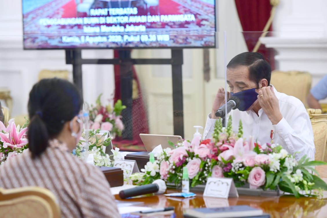 Presiden Joko Widodo, saat memimpin rapat terbatas untuk membahas penggabungan BUMN di sektor aviasi dan pariwisata pada Kamis, 6 Agustus 2020, di Istana Merdeka, Jakarta, melihat bahwa sektor yang sangat terdampak dari penurunan ekonomi di Indonesia antara lain sektor pariwisata dan penerbangan.
