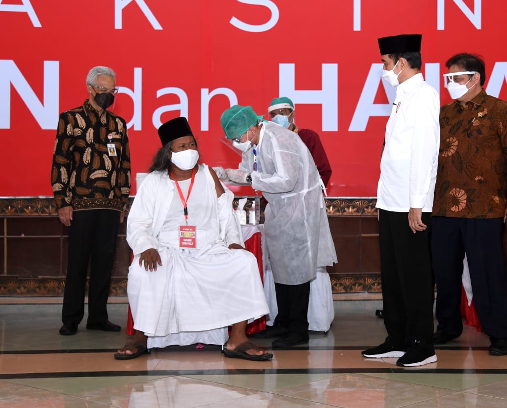 Presiden Joko Widodo dalam kunjungan kerjanya ke Provinsi Jawa Tengah turut meninjau jalannya pelaksanaan vaksinasi massal yang secara keseluruhan diperuntukkan bagi kurang lebih 1.000 penerima vaksin.