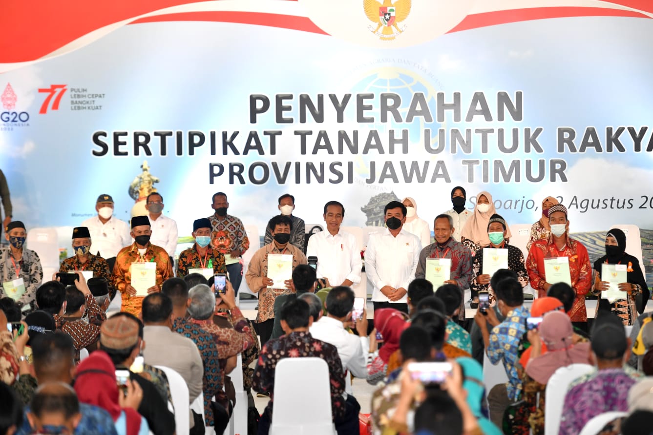 Presiden Joko Widodo didampingi Ibu Iriana Joko Widodo menyerahkan sertifikat tanah untuk rakyat di Gelora Delta, Kabupaten Sidoarjo, pada Senin, 22 Agustus 2022. Sebanyak 3.000 orang dari Kabupaten Sidoarjo, Kabupaten Malang, Kota Malang, dan Kabupaten Gresik hadir untuk menerima sertifikat tanah tersebut.