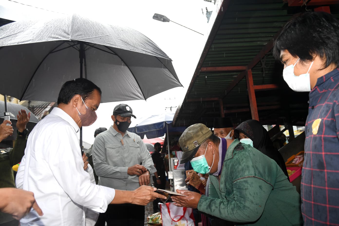 Presiden Joko Widodo beserta Ibu Negara Iriana Joko Widodo mengunjungi Pasar Kertek, Kabupaten Wonosobo, Provinsi Jawa Tengah, pada Selasa, 14 Desember 2021. Hujan deras yang mengguyur Pasar Kertek saat itu tidak menyurutkan langkah Presiden untuk menyapa para pedagang.