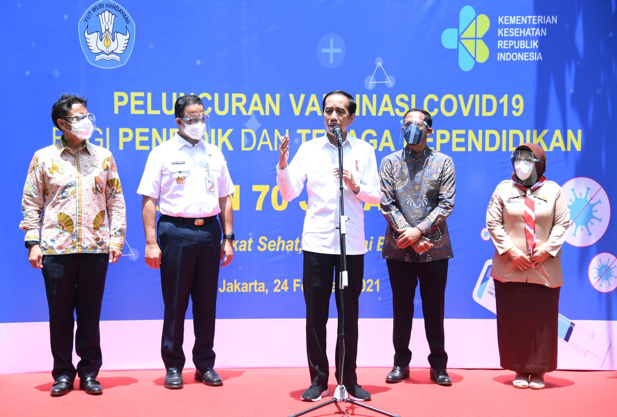 JAKARTA – Presiden Joko Widodo tinjau secara langsung kegiatan vaksinasi Covid-19 massal tahap kedua yang menyasar tenaga pendidik dan kependidikan. Kegiatan tersebut dipusatkan di SMA Negeri 70 Jakarta yang terletak di kawasan Bulungan, Kebayoran Baru, Jakarta Selatan, Rabu (25/2/2020).