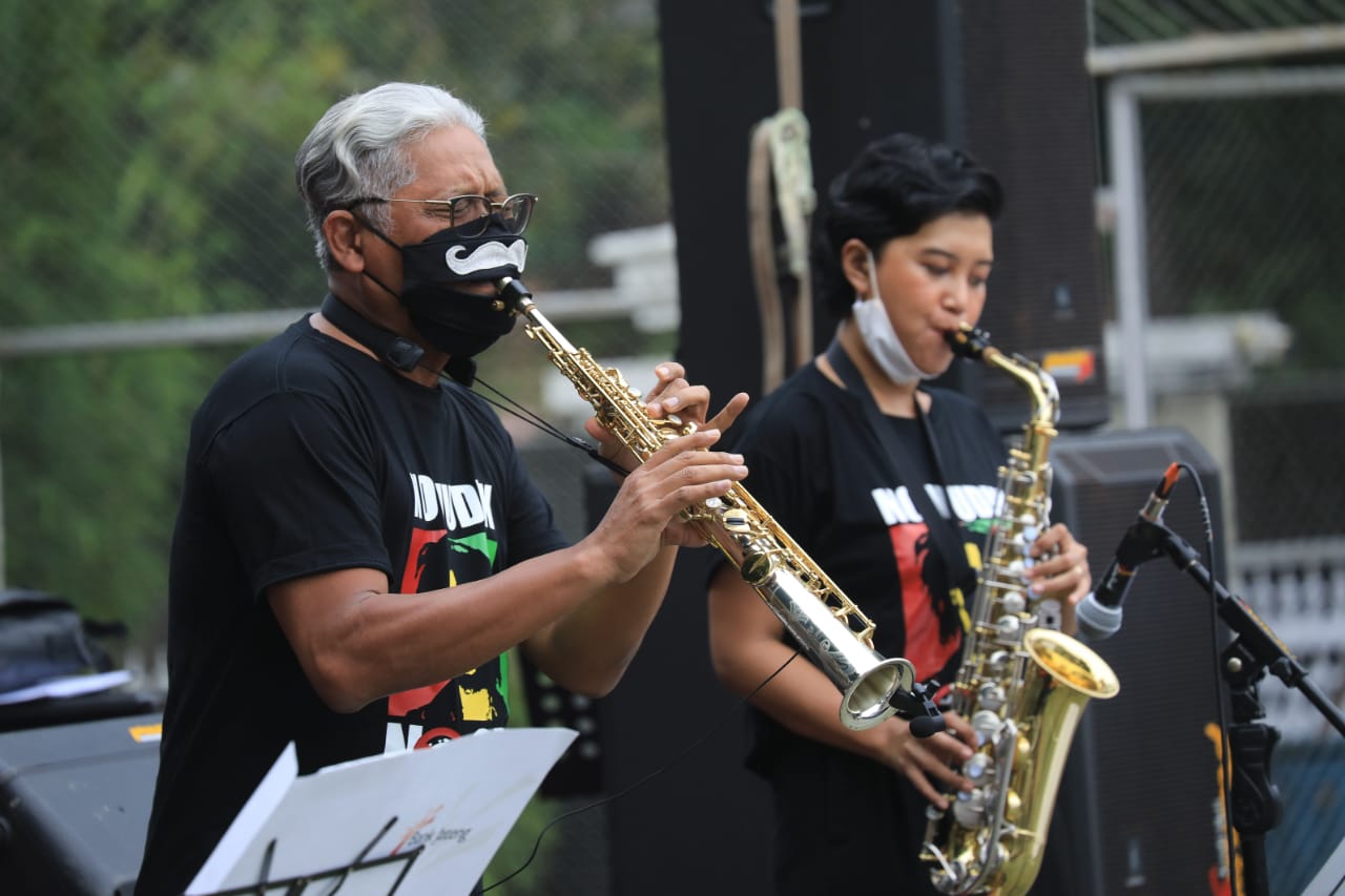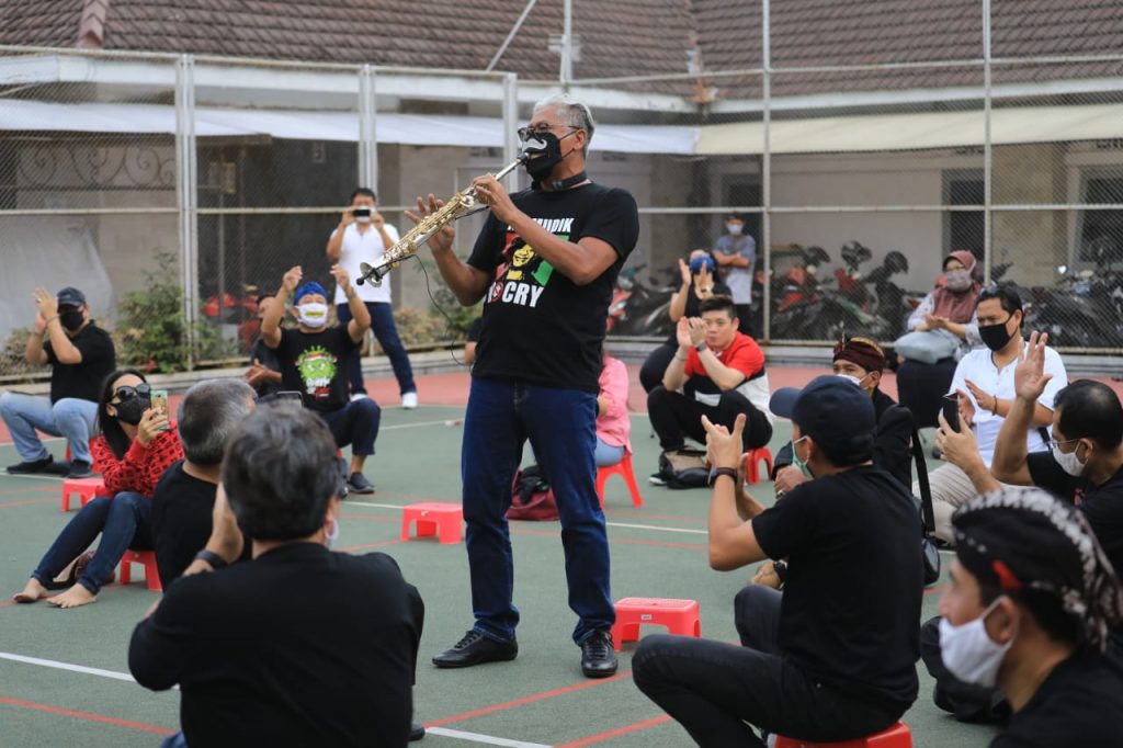 SEMARANG – Ada yang beda dengan perhelatan Panggung Kahanan #6 Mositifi COVID-19 di rumah dinas Gubernur Jawa Tengah, Ganjar Pranowo, Jumat (15/5). Yakni permainan sejumlah seniman beraksi memainkan irama saxophone.