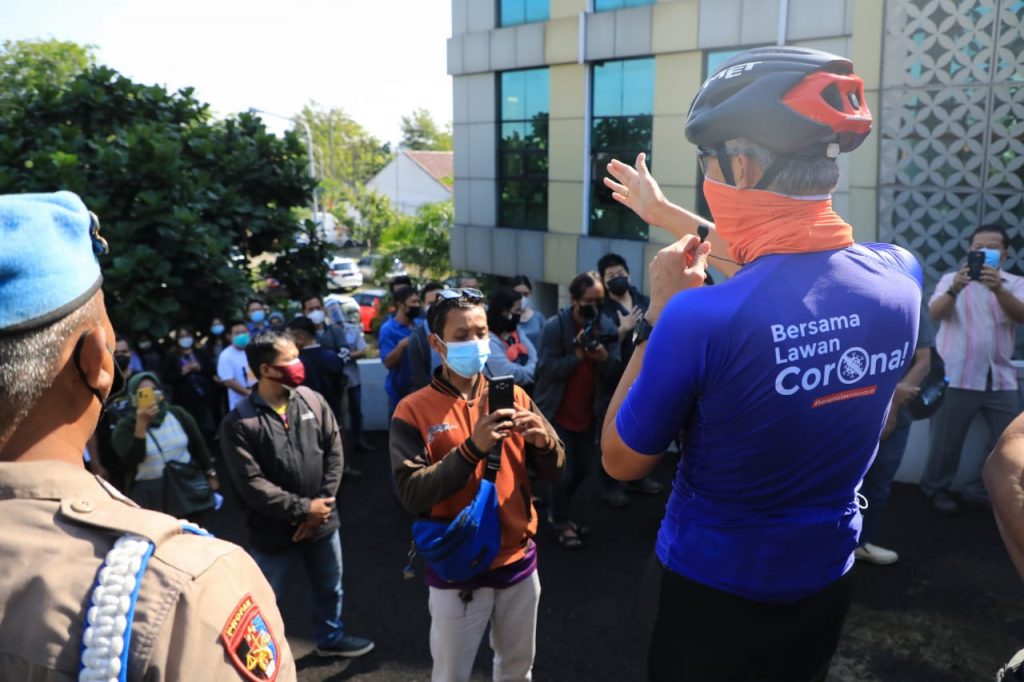 Ganjar yang saat itu sedang gowes keliling Kota Semarang mendadak berhenti ketika melihat ada keramaian di gedung UTC. Begitu memasuki area parkir, Ganjar terkejut ketika melihat kerumunan warga yang sedang antre untuk mendapatkan vaksin. Setelah memarkir sepeda, Ganjar langsung berseru melalui pengeras suara yang terpasang di sepeda untuk meminta warga menjaga jarak saat antre menunggu giliran.