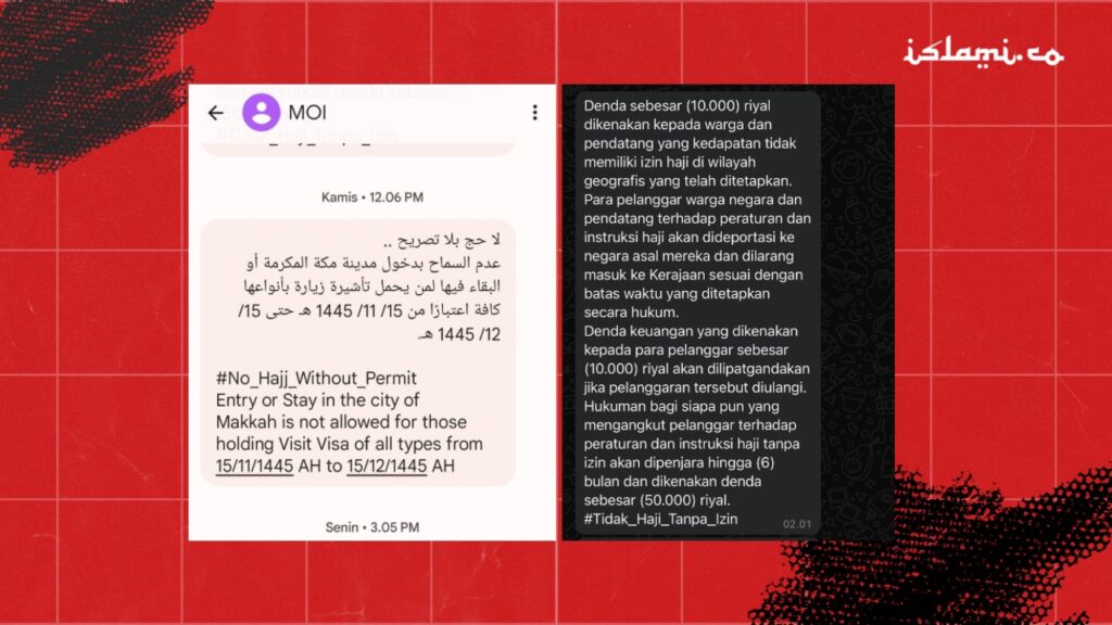 Dalam sms tersebut juga dijelaskan bahwa pemegang visa selain visa haji dilarang tinggal di Mekkah selama musim haji, yaitu mulai tanggal 11 Dzulqaidah – 15 Dzulhijjah 1445 H.