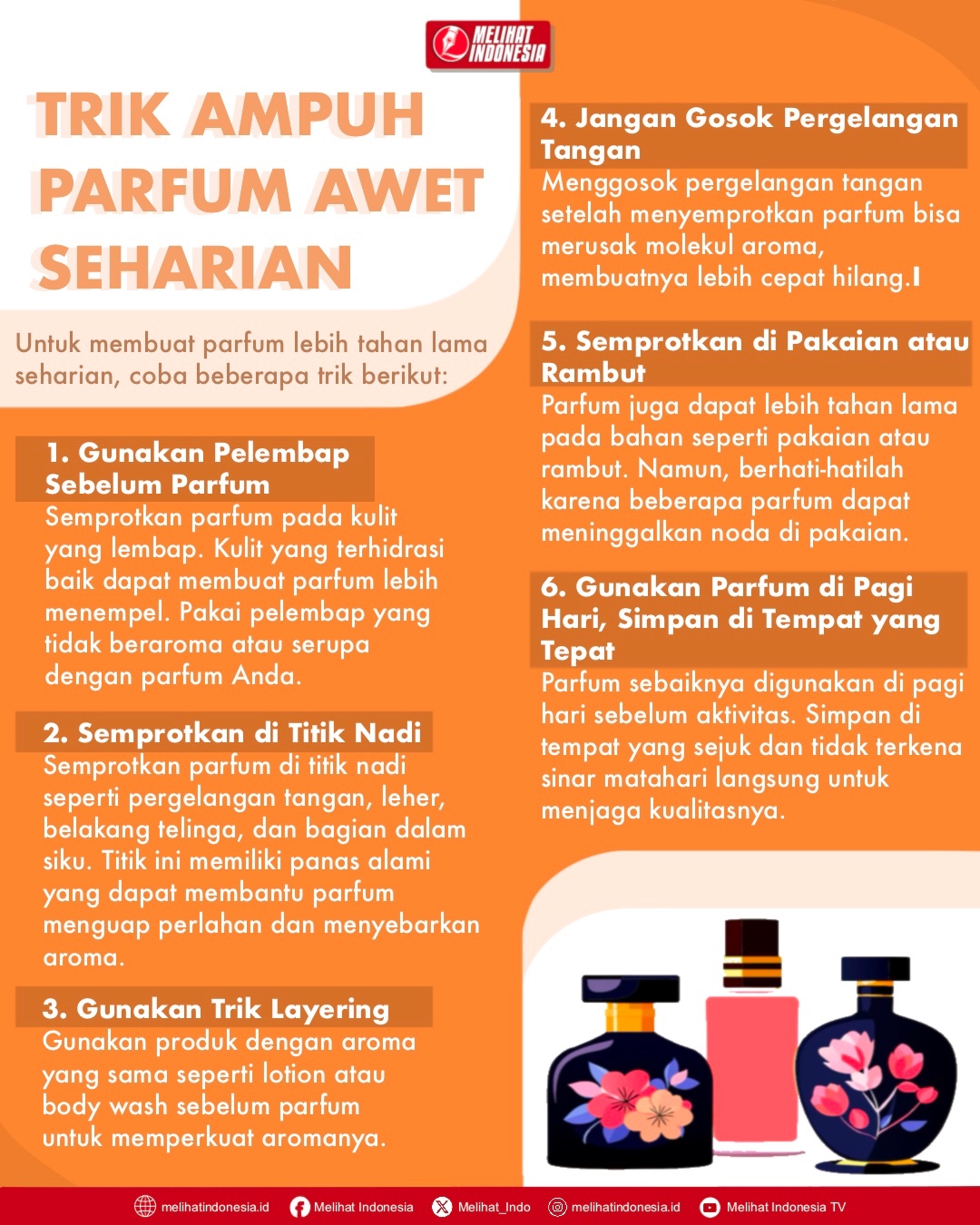 MELIHAT INDONESIA – Untuk membuat parfum lebih tahan lama seharian, coba beberapa trik berikut: