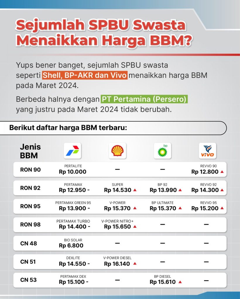 MELIHAT INDONESIA – Memasuki bulan Maret 2024, sejumlah harga Bahan Bakar Minyak (BBM) di Stasiun Pengisian Bahan Bakar Umum (SPBU) swasta mengalami perubahan.