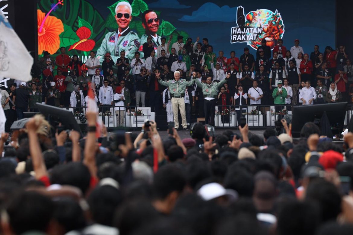 SEMARANG – Puluhan ribu massa pendukung capres-cawapres nomor urut 3 Ganjar-Mahfud menghadiri Hajatan Akbar di lapangan Pancasila, Simpang Lima, Semarang,Jawa Tengah, Sabtu (10/2/2024). Kampanye di Semarang menjadi kampanye penutup Ganjar Pranowo-Mahfud MD setelah mereka keliling ke-450 titik di wilayah Indonesia untuk menyerap aspirasi.